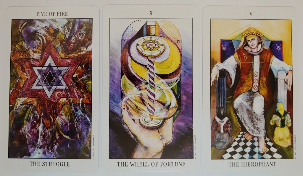 Sometimes to anchor my thoughts for a reading I like to revisit the words of the creator(s) of the deck I’m using; it’s an interesting exercise to see what stands out from those. The accompanying booklet with the Tarot of the Spirit talks, with respect to the Five of Fire (aka Wands), about “relinquishing that which is obsolete.” Sometimes we need to let go of ideas, preconceptions, or limits in order to progress towards the things we want.
