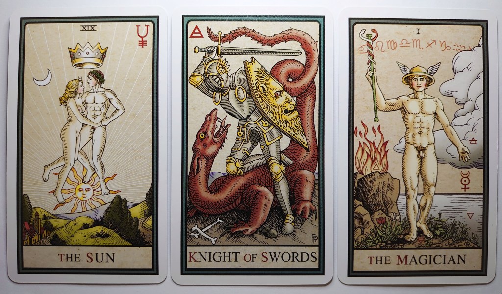 In terms of the cards themselves, this chimes with the Knight of Swords taking centre stage. He’s someone who is sharp, quick, intelligent – but he can be apt to conceal it behind all that armour. Consider what lies underneath the defences of those you come into contact with over the coming days.