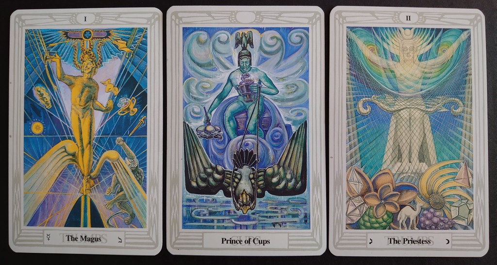 Phew. Good job I was sitting down! There’s a great deal of power in those cards, isn’t there? The Magus and the Priestess. Master of external will and manifestation; ruler of the intuitive, psychic realm and keeper of secrets. What a formidable pair they make.