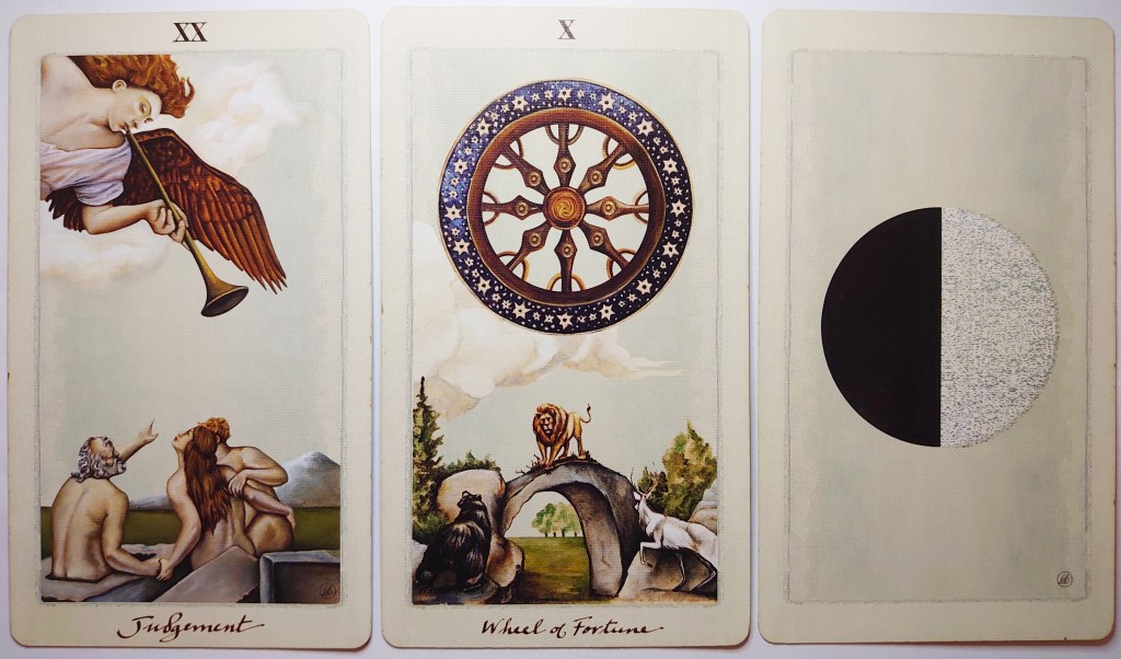 Two major arcana cards to complete the reading feels like another sign of big shifts: these cards especially. Notice that they’re all about the X’s? I’m a pretty bad numerologist, but tens (including the 10s in each suit of tarot pips) are often associated with the completion of a cycle, a point pregnant with possibilities as to what happens next. Judgement suggests that we’ll know that when we hear it: that’s a pretty big trumpet, right? The Wheel of Fortune, though… I have a feeling that whatever’s shifting, this is not about the kind of change where the results are fixed, permanent, definite. A new phase of some kind perhaps, but a step along the road rather than the end of the journey.
