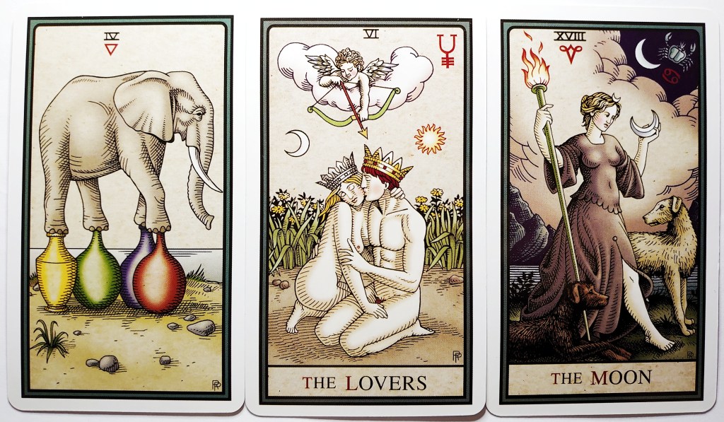 But back to this week. If we are at a stalemate in a relationship just now, unsure where to turn or afraid to make a bold move in case we break something, this is a time for caution. Robert Place describes this version of the Moon as a card of “rest, retreat, anticipation, preparation, dreams.” For me, its advice is to heed those dreams, our intuitions and the things that come from the dark and still places within us. These are where we will find answers.