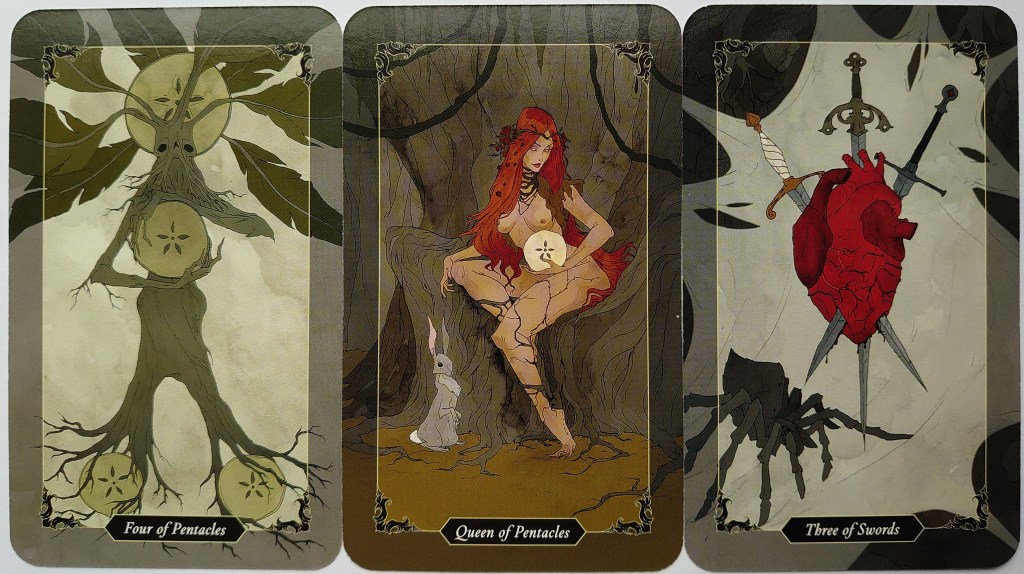 Perhaps it is, because on the other side we find the much feared Three of Swords. I really like the Dark Wood deck’s particular take on this card: the accompanying guide says it is “the wound that lets in the light… To imprison love is to lose its essence. Allow the Three of Swords to break your heart wide open.” So often we try to shield ourselves from pain by avoiding intense emotional experiences, attempting to rule the heart with the head. We would rather risk being stuck in the web – possibly even devoured – than feel the discomfort necessary in order to set our hearts free. How well does this really serve us in the end?