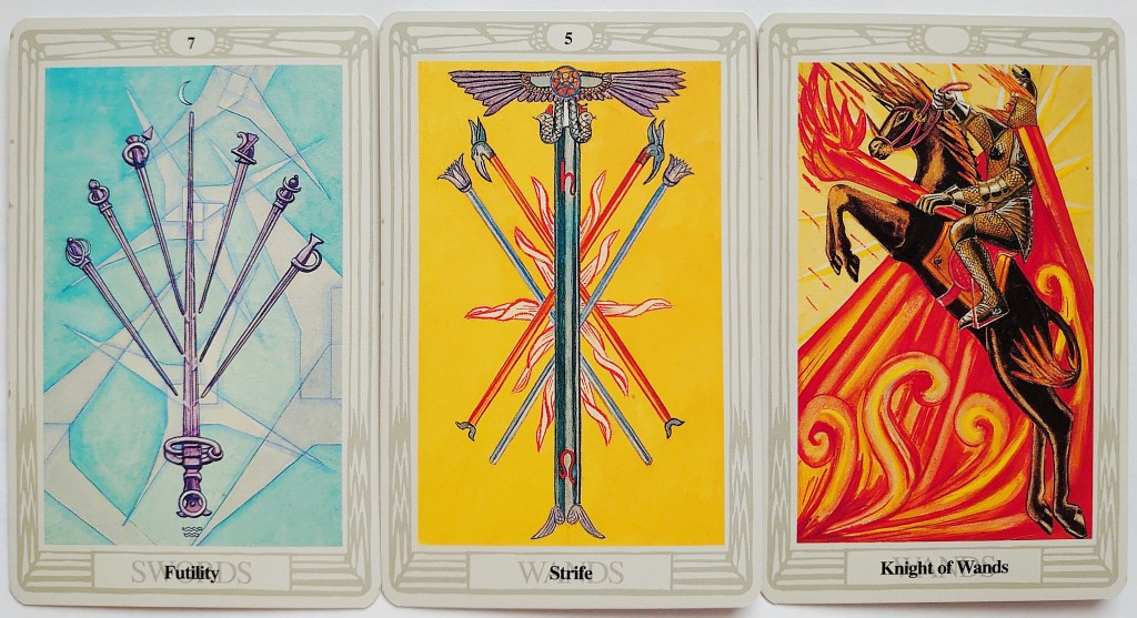 The Lord of Strife (!) meanwhile indicates quarrels, niggling resentments or sometimes inner conflict about whether we are doing the right thing. Lastly the Knight – well, he too is often related to doing the right thing, but sometimes all that fire lends him an impetuosity that might risk his decisions being too hasty.