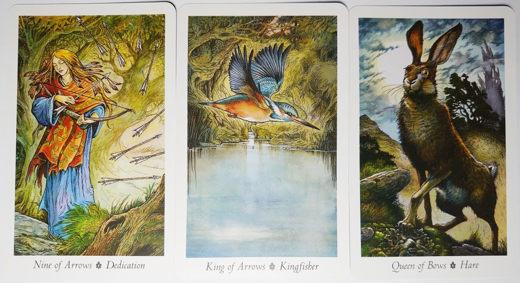 The Nine of Arrows is the Wildwood equivalent of the Nine of Swords, which is often a card about anxiety or obsessive thinking. It’s true that our lady here is lost in thought, playing her bow like an instrument while arrows fly past her. She encourages us, I think, to be mindful of what we give our attention to this week – there is value in close focus, but few of us can repel arrows purely by the strength of our concentration!