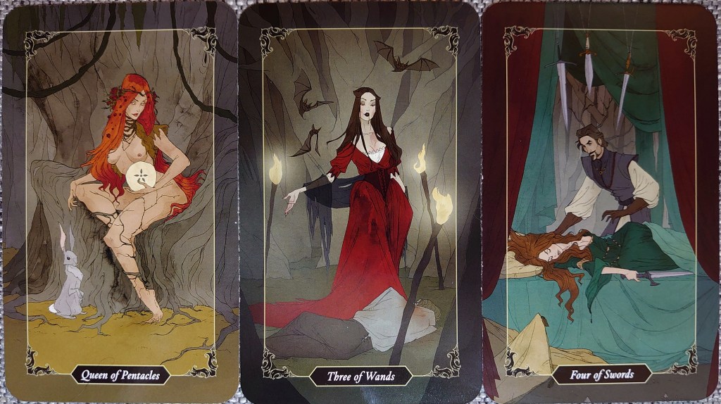 It’s quite a charged reading, looking closely at the cards, isn’t it? The sensual Queen, the eroticism of the vampire, the tension of the scene in the Four of Swords. Whichever areas of our lives we focus our attention on this week, they should be those which make our hearts beat that little bit faster, I think. The things that make life worth living.